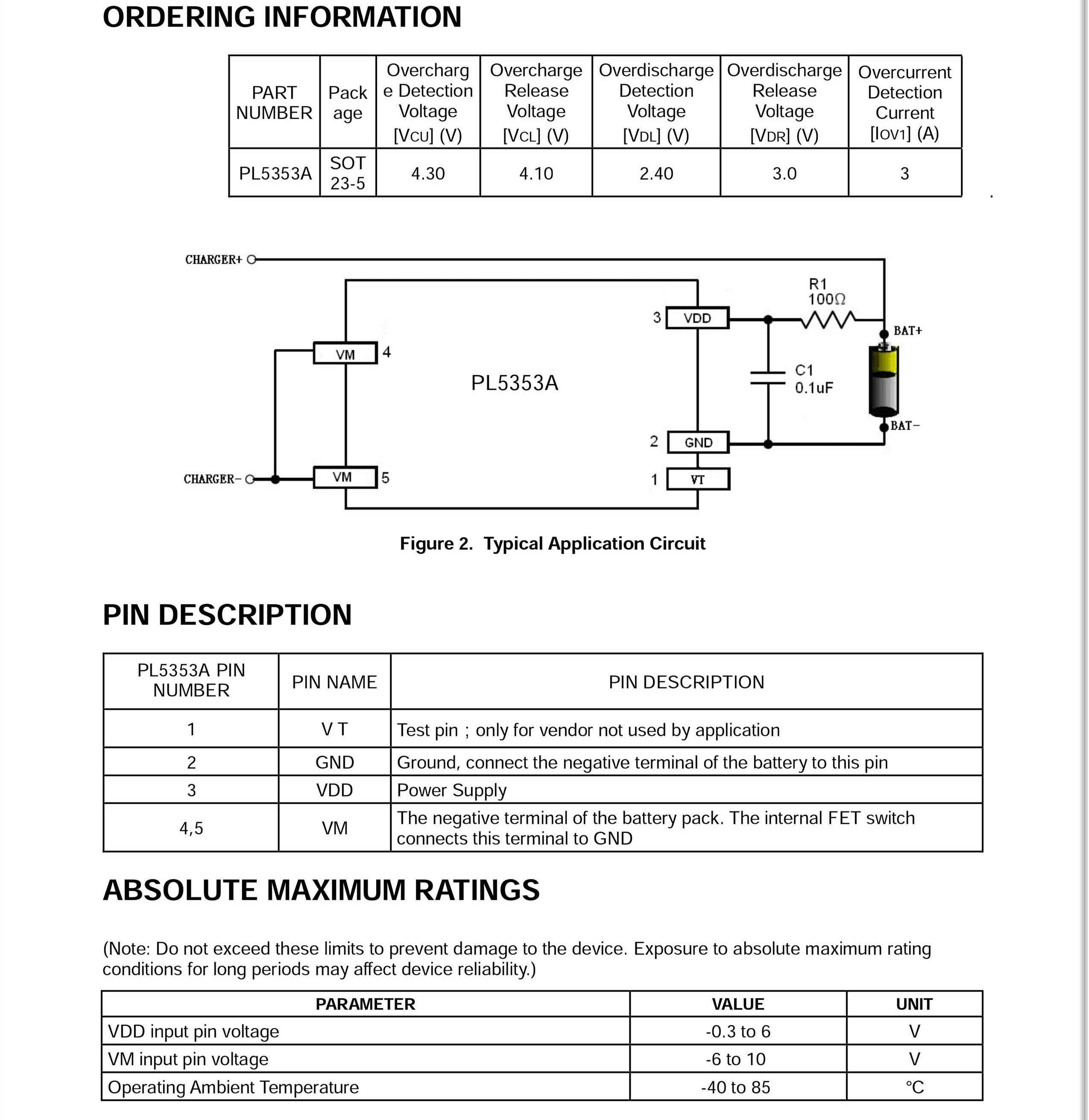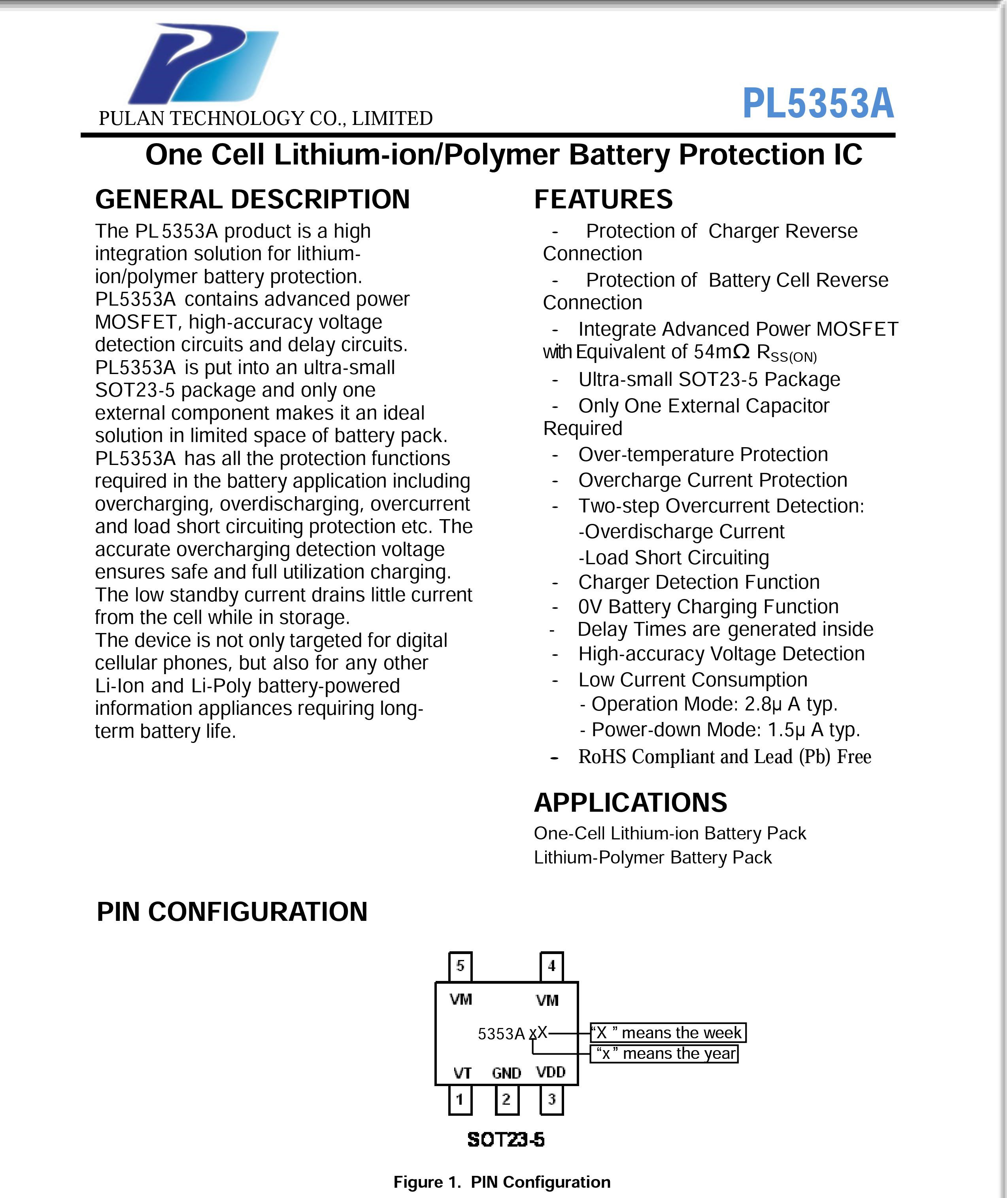 PL5353A是單節(jié)鋰電池保護(hù)IC 外圍僅一個(gè)100K的電阻和一個(gè)0.1uf的電容 SOT23-5封裝。 |