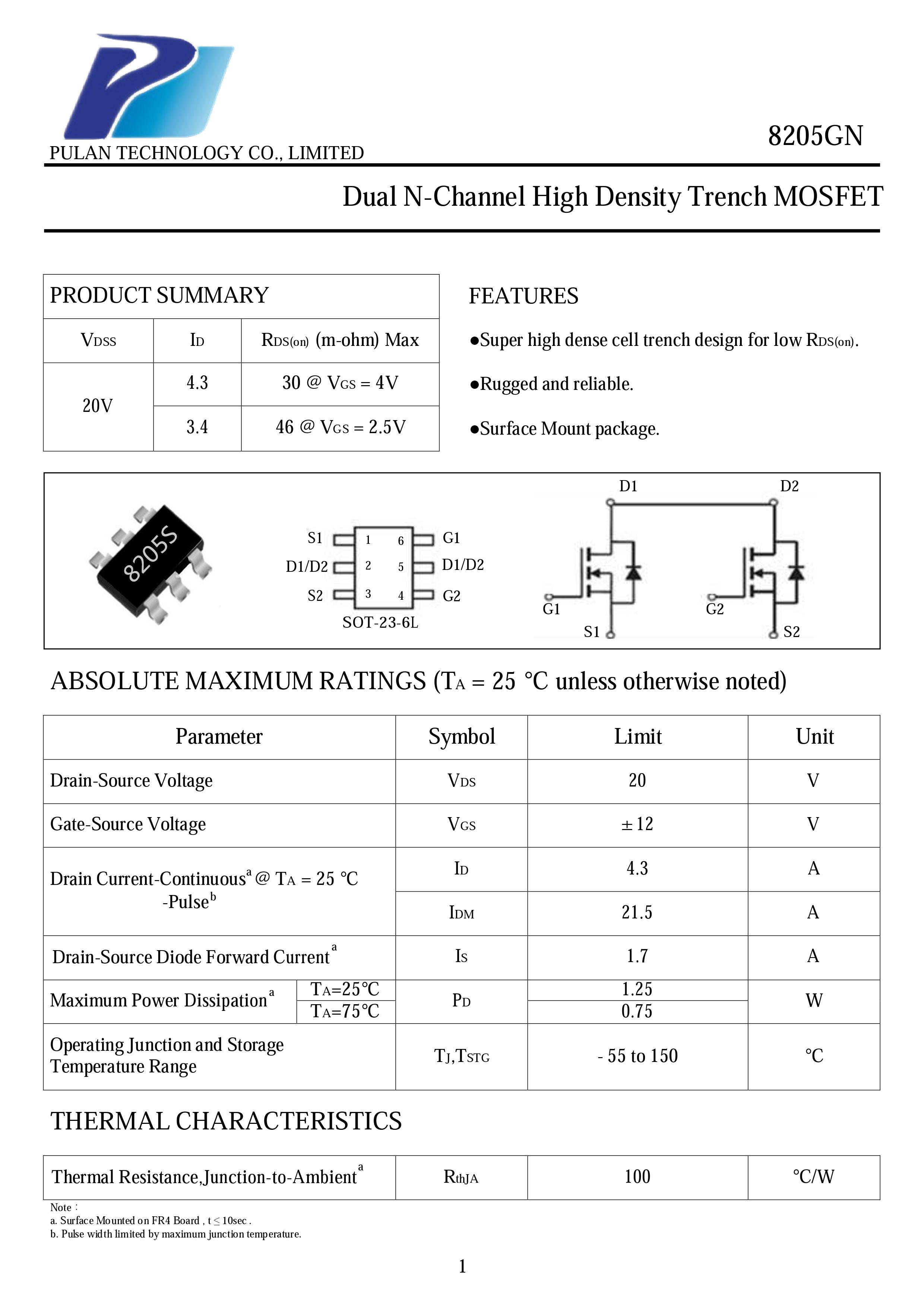 8205有兩種封裝:SOT23-6 (20V 4.3A) TSSOP8(20V 6A) 8205常與DW01鋰電池保護(hù)IC,搭配組成完整的鋰電池保護(hù)電路。 |