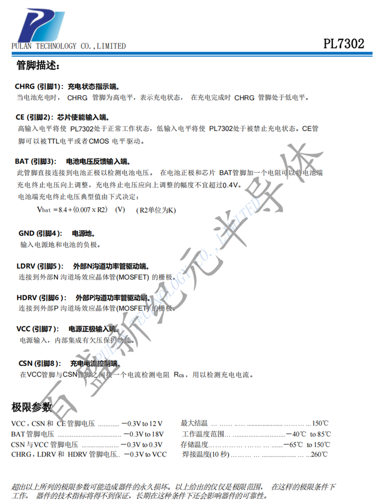 其他功能包括芯片使能輸入, 狀態(tài)指示輸出端等。PL7302采用8管腳的SOP8封裝
