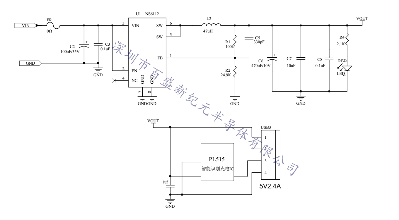 NS6112單口2.4A智能識(shí)彆車充原理圖: