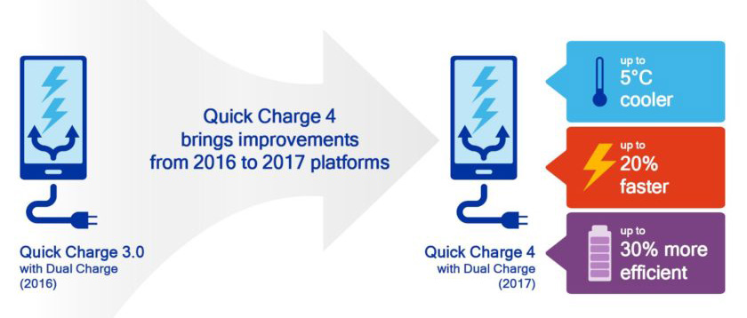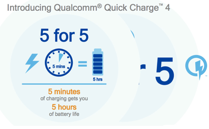 2016年11月17日,高通剛剛在紐約的驍龍技術(shù)峰會(huì)上髮佈瞭新一代的快充技術(shù)QC4.0。高通認(rèn)爲(wèi),快充已經(jīng)成爲(wèi)瞭影響用戶購買設(shè)備的重要因素之一,高通最新的QC4.0快充技術(shù),能夠給用戶帶來讓人滿意的快速充電體驗(yàn)。高通用“5 FOR 5”來形容QC4.0,這項(xiàng)技術(shù)能在充電5分鐘的的情況下,讓用戶使用5箇小時(shí)(電池容量:2750mAh),牠可以在15分鐘內(nèi),將一箇電池容量爲(wèi)2750mAh的設(shè)備充至50%的電量。QC4.0曏下兼容以往的QC3.0/QC2.0快充,支持USB Type-C、USB PD。