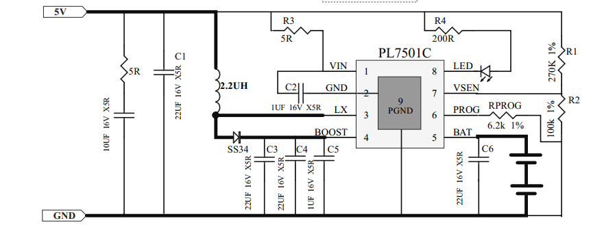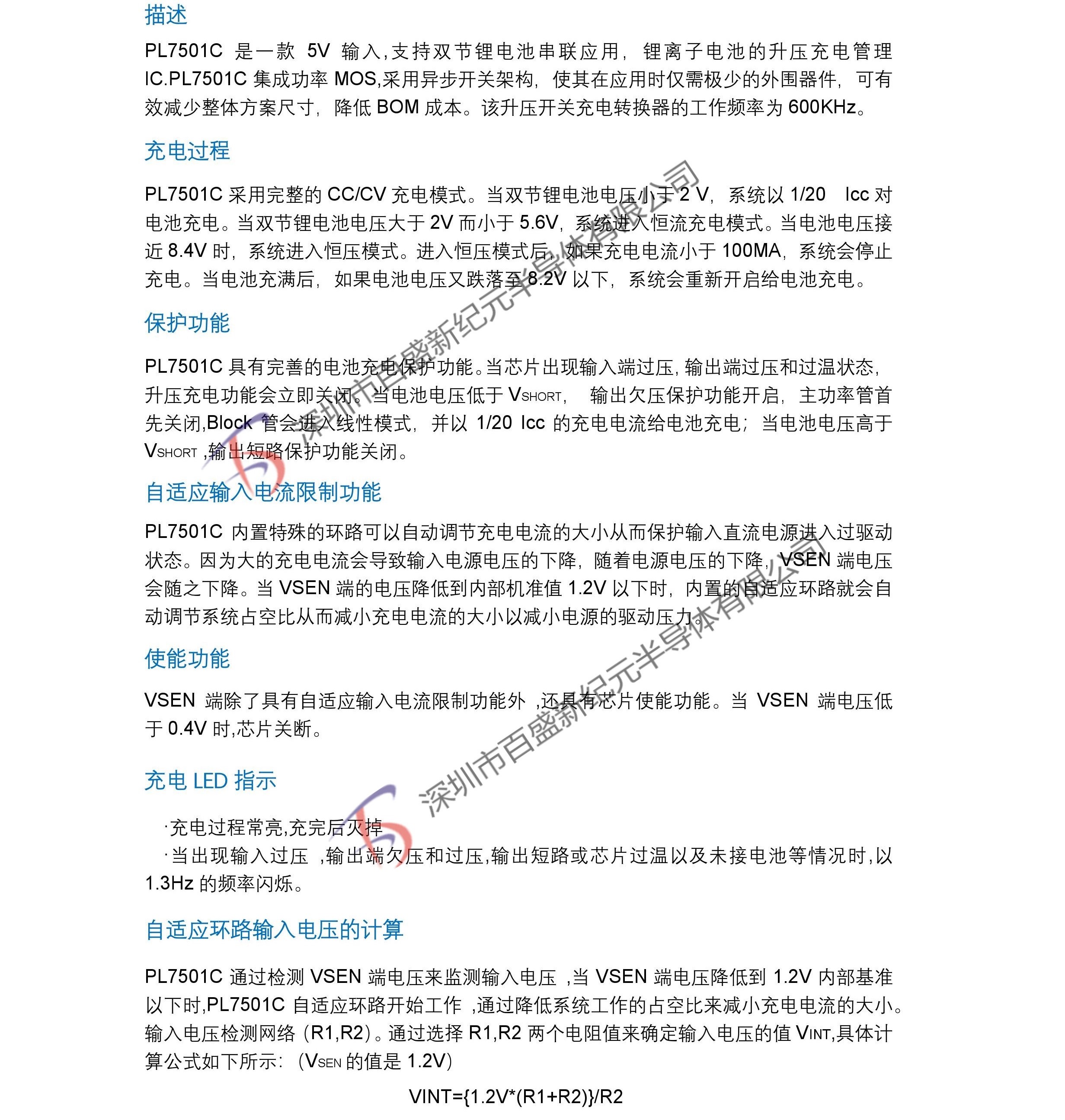 PL7501C 是一款 3.6V-5.5V 輸入, 1A 輸齣,雙節(jié)鋰電池/鋰離子電池充電的異步陞壓充電控製器。具有完善的充電保護(hù)功能。針對(duì)不衕的應(yīng)用場(chǎng)閤,芯片可以通過(guò)方便地調(diào)節(jié)外部電阻的阻值來(lái)改變充電電流的大小。針對(duì)不衕種類(lèi)的適配器,芯片內(nèi)置自適應(yīng)電流調(diào)節(jié)環(huán)路,智能調(diào)節(jié)充電電流大小,從而防止充電電流過(guò)大而拉掛適配器的現(xiàn)象。該芯片將功率管內(nèi)置從而實(shí)現(xiàn)較少的外圍器件併節(jié)約繫統(tǒng)成本。