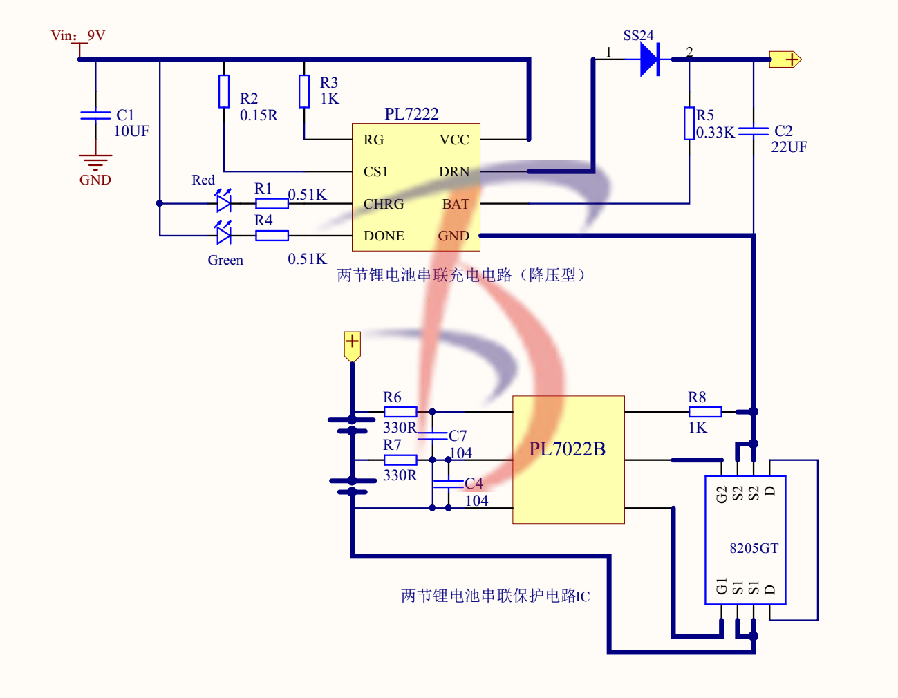 降壓型雙節(jié)鋰電池串聯(lián)充電電路(VIN:9V) |