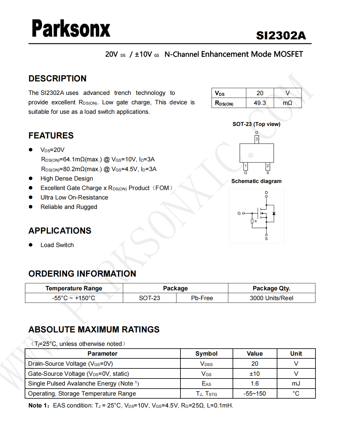 - 小型封裝 (SOT-23):SI2302採用SOT-23封裝。這種小外殼特彆適閤需要爲(wèi)手機和平闆電腦等便攜式設(shè)備節(jié)省空間的設(shè)計。