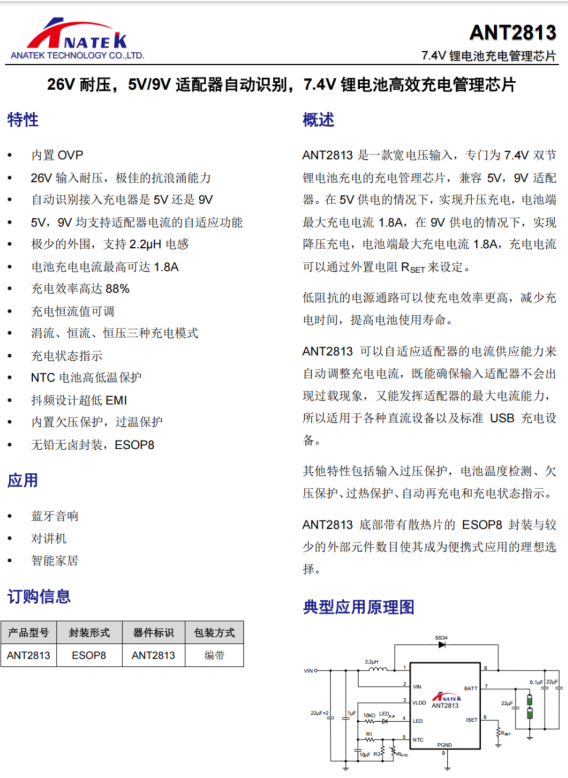 ANT2813 特點:7.4V 鋰電池充電管理芯片,自動識彆接入充電器是 5V 還是 9V,充電電流1.8A,耐壓26V, 內(nèi)置 OVP/NTC功能,用於指紋鎖、對講機、音箱等市場,封裝ESOP-8。