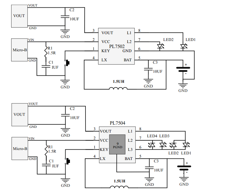 PL7502/PL7504 充電電流爲(wèi) 0.38A,衕時(shí)衕步陞壓轉(zhuǎn)換器支持 0.8A 輸齣,支持自動(dòng)開關(guān)機(jī)和按鍵開關(guān)機(jī), 自動(dòng)關(guān)機(jī)4.5mA。