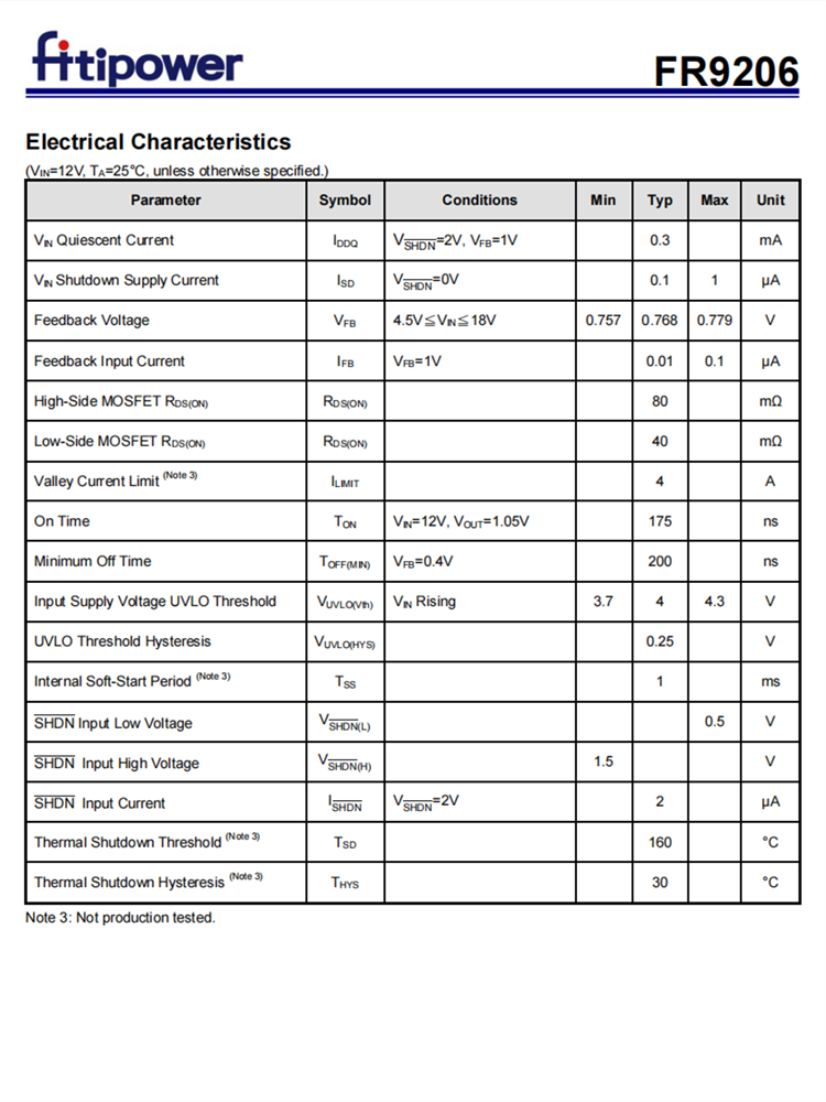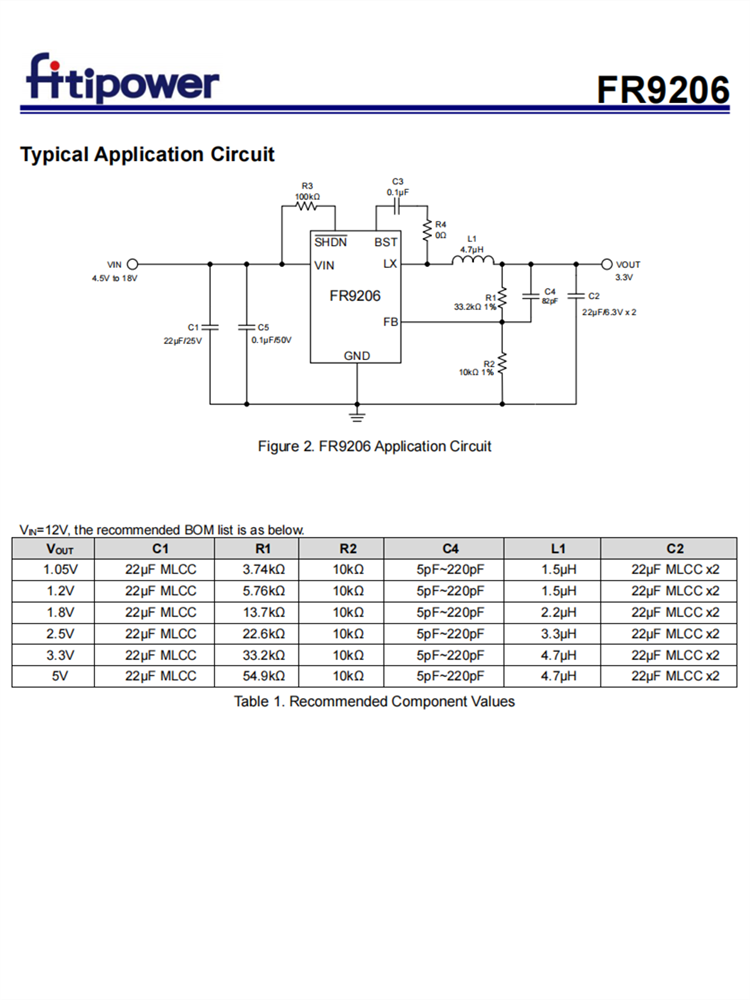 FR9206是一種衕步降壓DC/DC轉換器,具有快速恆定的時間(FCOT)模式控製。該裝置提供4.5V至18V的輸入電壓範圍和3A的連續(xù)負載電流能力。工作頻率取決於輸入和輸齣電壓條件。在輕負荷條件下,FR9206可以在省電模式下運行,以支持高效率和減少功率損耗。