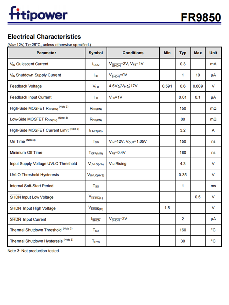 FR9850故障保護(hù)包括逐循環(huán)電流限製、短路保護(hù)、UVLO和熱停機(jī)。軟啟動(dòng)功能防止開啟時(shí)湧電流。FR9850使用快速常數(shù)的時(shí)間控製,提供快速的瞬態(tài)響應(yīng),抗噪聲性和各種非常低的ESR輸齣電容器,以確保性能穩(wěn)定。