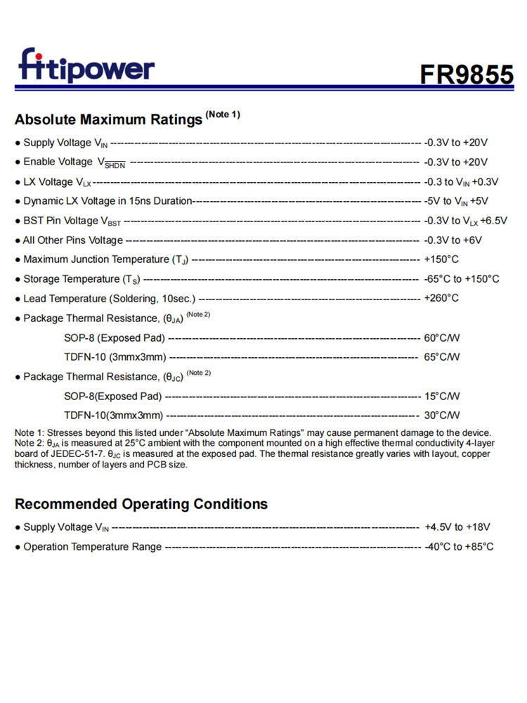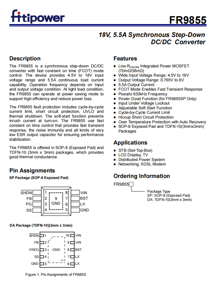 FR9855採用SOP-8(暴露墊)和TDFN-10(3mm x 3mm)封裝,提供良好的導(dǎo)熱性。