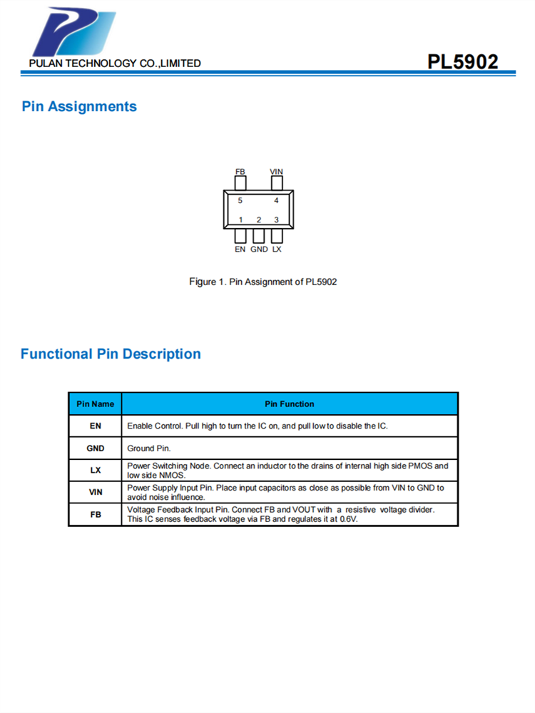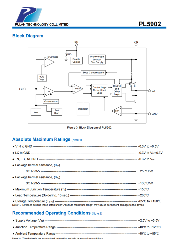PL5902是一種高效、高頻衕步DC-DC降壓調(diào)節(jié)器。100%佔(zhàn)空比功能提供瞭低退齣操作,延長(zhǎng)瞭便攜式繫統(tǒng)的電池壽命。