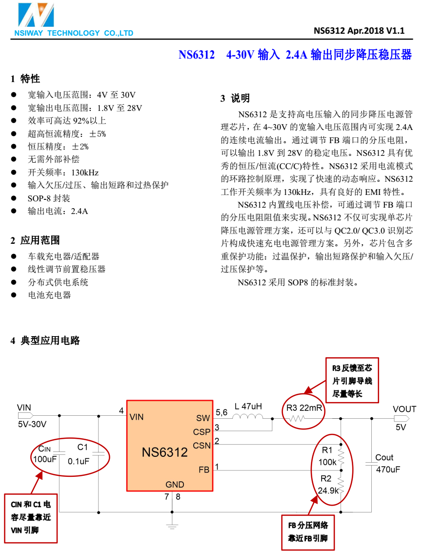 - NS6312 / NS6316適用應(yīng)用於車(chē)充等降壓電路應(yīng)用中,具有線纜電壓補(bǔ)償功能,可以補(bǔ)償充電線纜産生的壓降,而且補(bǔ)償電壓大小可以通過(guò)FB的上拉電阻阻值來(lái)進(jìn)行調(diào)整。