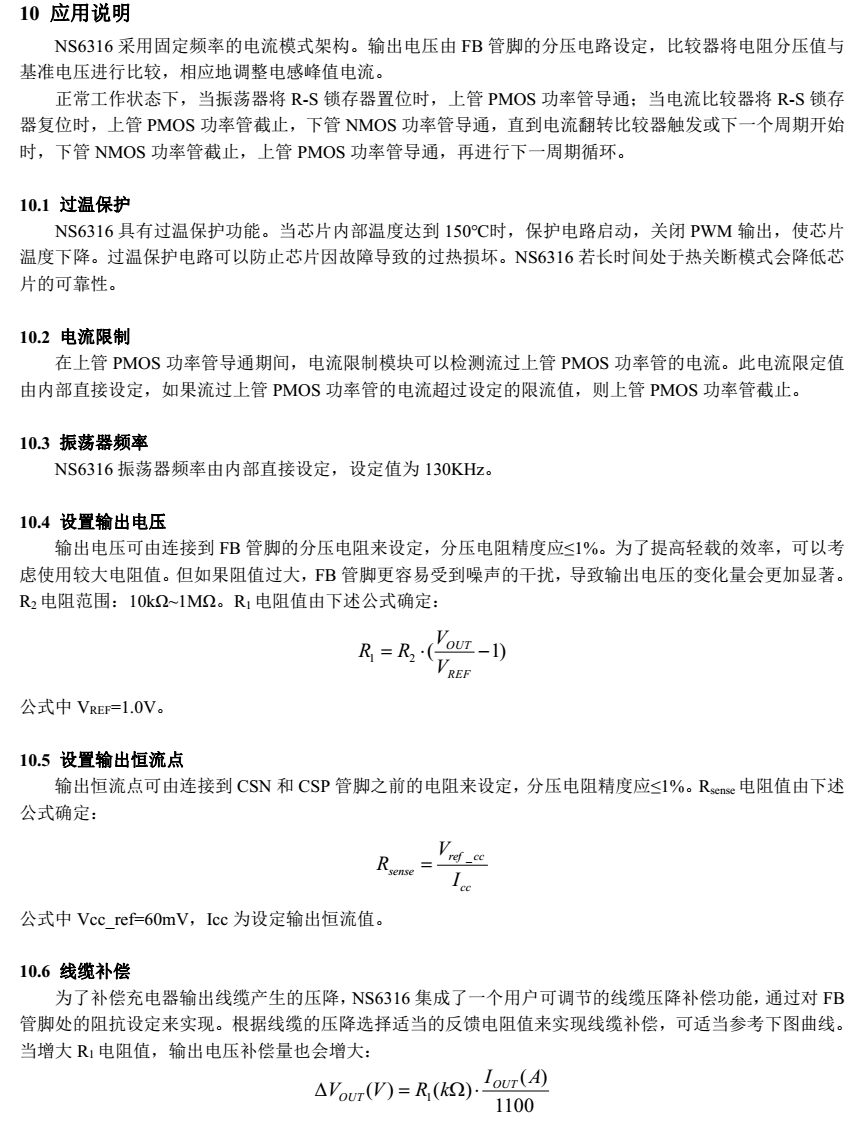 NS6312 / NS6316適用應用於車充等降壓電路應用中,具有線纜電壓補償功能,可以補償充電線纜産生的壓降,而且補償電壓大小可以通過FB的上拉電阻阻值來進行調(diào)整。