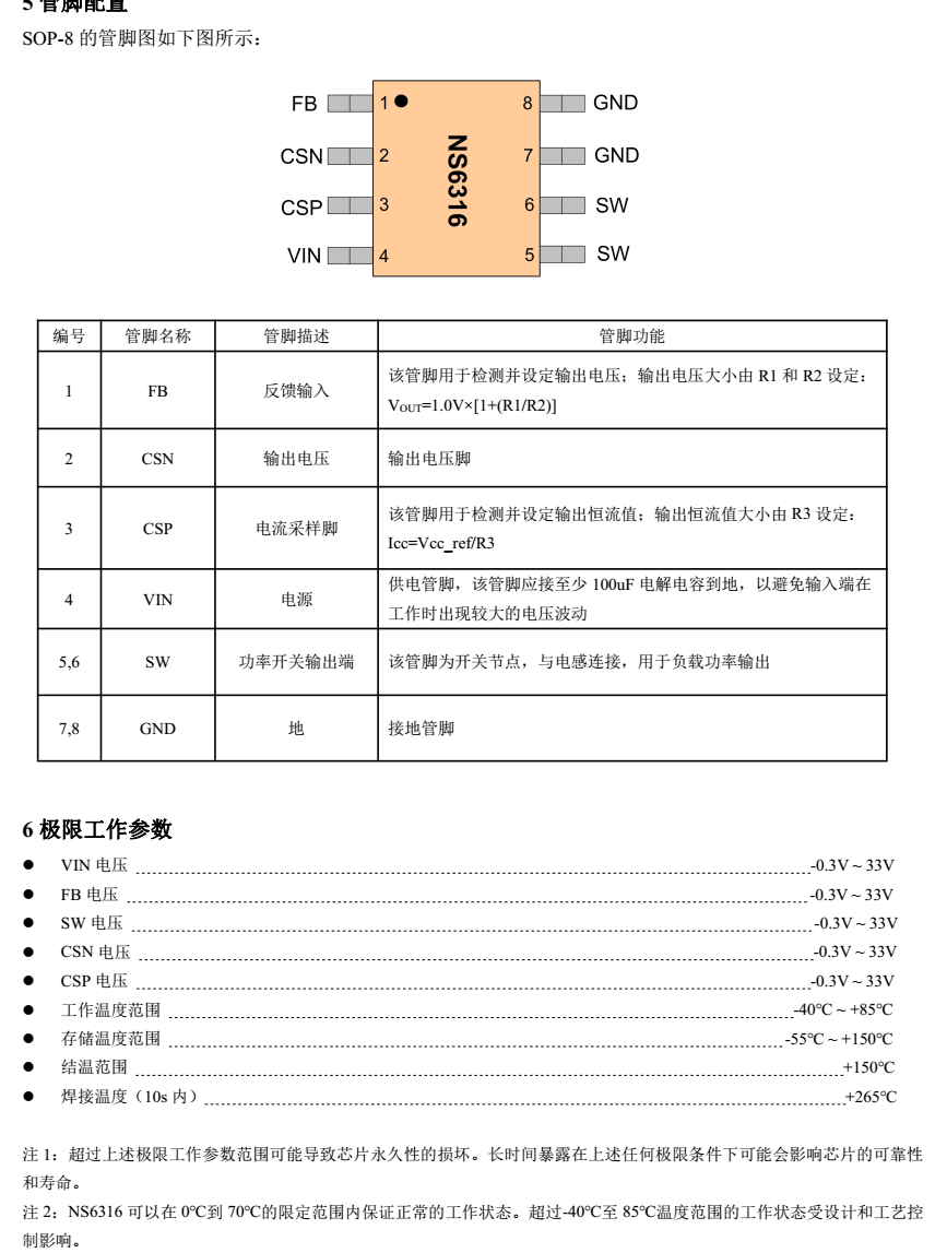 NS6316 是支持高電壓輸入的衕步降壓電源管理芯片, 在 4~30V 的寬輸入電壓範圍內(nèi)可實現(xiàn) 3A的連續(xù)電流輸齣。 通過調(diào)節(jié) FB 端口的分壓電阻,可以輸齣 1.8V 到 28V 的穩(wěn)定電壓。 NS6316 具有優(yōu)秀的恆壓/恆流(CC/C)特性。 NS6316 採用電流模式的環(huán)路控製原理, 實現(xiàn)瞭快速的動態(tài)響應。 NS6316工作開關(guān)頻率爲 130kHz, 具有良好的 EMI 特性。