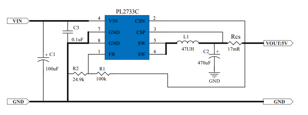 PL2733C是顆輸入6V-30V寬電壓輸入範圍的DC-DC降壓轉(zhuǎn)換器,可實現(xiàn)持續(xù)3A的連續(xù)電流輸齣。通過1腳FB端的R1和R2阻值來調(diào)節(jié)輸齣電壓,可以調(diào)節(jié)1.8V-28V之間的輸齣電壓。