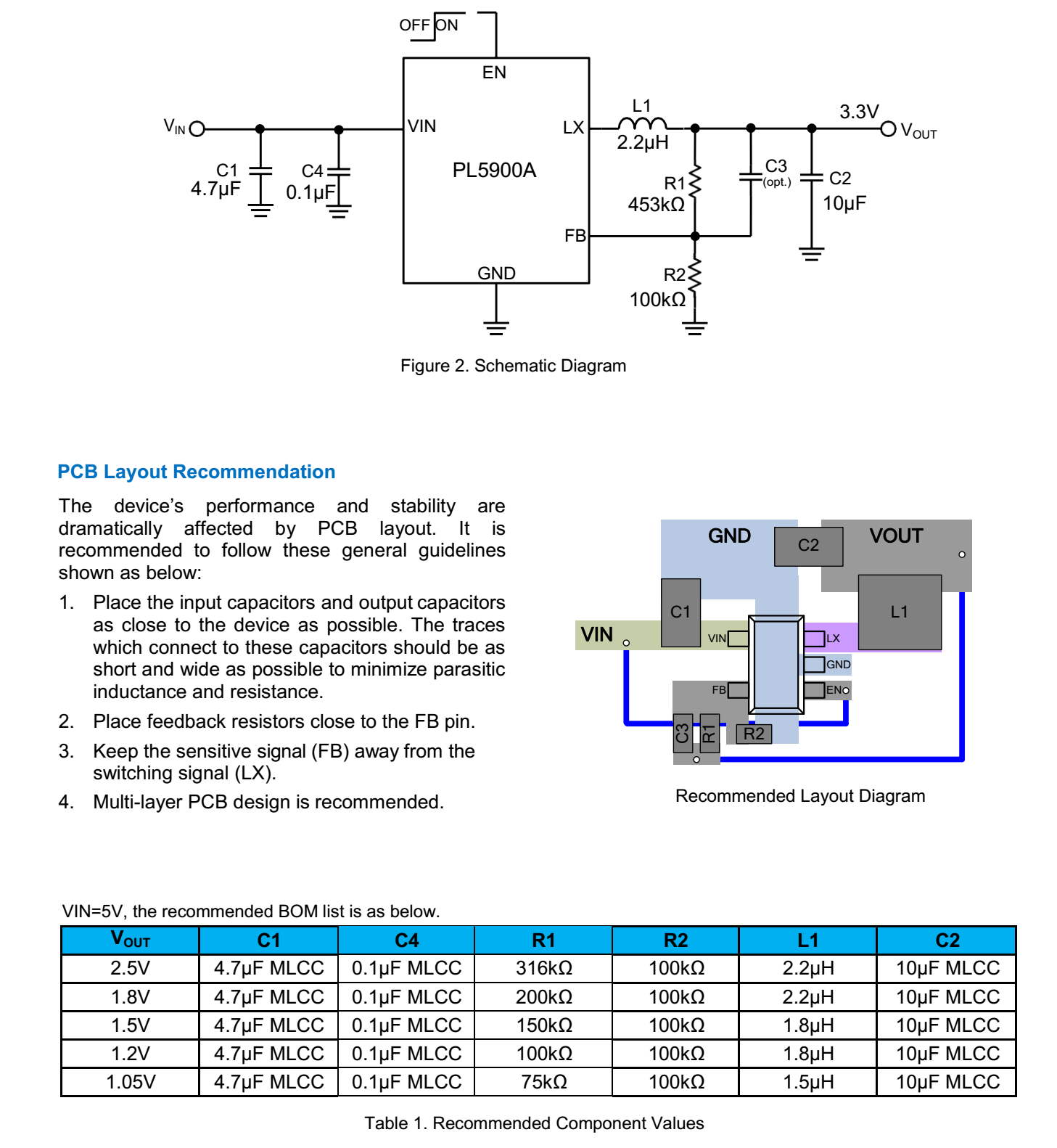 PL5900A開關頻率內部設置爲 1.5MHz, 允許使用小的錶麵安裝電感和電容器。